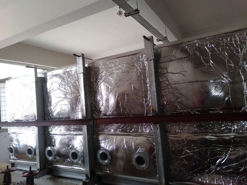 玻璃鋼無內件外加固保溫水箱設計內加強結構型式,水箱箱體為型板裝配氬弧焊接而成,型板拼裝交叉部位設計雙向加強聯桿。箱體側板與底板間設置垂直加固柱,水箱側板四周外每層相鄰。型板間設置水平加強板,加強材料同箱體材料。水箱底部設置鍍鋅槽鋼支架。水箱附件有檢查孔、內外扶梯、工藝管口、材料均為不銹鋼,水箱工藝管口按用戶提供的圖樣設計。